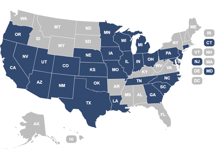 Arizona California Colorado Connecticut Georgia Illinois Indiana Iowa Kansas Louisiana Maryland Michigan Minnesota Missouri Nebraska Nevada New Jersey New Mexico North Carolina Ohio Oklahoma Oregon Pennsylvania South Carolina Tennessee Texas Utah Wisconsin